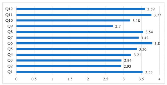 Students’ attitudes toward fine dust were at a moderate level, i.e., 3.35 (Figure 4). As for the attitude toward fine dust by survey item, the survey items with a higher than moderate degree of implementation of activities related to fine dust were Q6 = 3.80, Q11 = 3.77, and Q5 = 3.63, in descending order. The degree of implementation was relatively low for items Q9 = 2.70, Q2 = 2.93, and Q3 = 2.94.