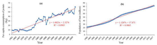 The effects of climatic change on agricultural production is expected to be most severe in global dry and semi-arid regions like Iran [7]. Mean annual rainfall in Iran is around 250 mm, which is less than a third of the global mean rainfall [17,18] and most parts of this country experience severe dry conditions [19,20,21]. Therefore, Iran could face a serious challenge in meeting food security in the presence of climate change [1,7]. Furthermore, dramatic population growth and the increase in food demand along with a scarcity of water resources exert more pressure on the agriculture of Iran [22,23,24]. The potato is the second most critical food crop after wheat [25] and also one of the most affordable and staple food resources in Iran, which has been identified as one strategic crop to achieve food security [26,27]. This crop is cultivated on about 147,000 hectares with an average yield of more than 34 tons per ha in Iran. This country, with an annual production of approximately 5 million tons of potato, is the twelfth country in the world for potato production, and the fourth in Asia [28]. Per capita consumption of potato in Iran has increased from almost 9 kg in 1961 to 60.97 kg in 2011 (see Figure 1a). Potato production is highly sensitive to changing climate conditions, and climatic change is one of the major challenges to potato production to meet the rising food security concerns [29]. Hence, feeding the ever-growing population (see Figure 1b) will be a major challenge in Iran. Accordingly, evaluating the impact of climatic change on Iran’s potato production in the future to ensure food security and decrease the adverse impacts of climate change is a vital need.