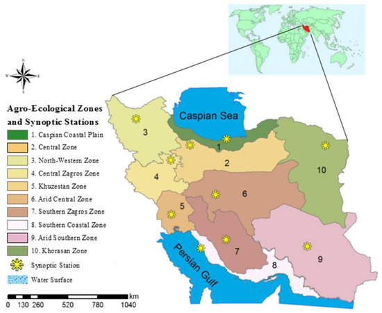 Iran is located in southwest Asia. Geographically, it has been extended from latitude 25° to 40° N and longitude 44° to 63° E. In this area, the altitude varies from −59 m (Caspian coasts) to >5300 m (Damavand mountain), which has a considerable influence on the diversity of the climate [53,73]. Therefore, Iran’s climatic conditions have fluctuated from hyper-humid (with annual precipitation of more than 1000 mm) in the northern parts to hyper-arid (with annual precipitation of less than 100 mm) in southern regions. As a whole, arid and semi-arid climatic conditions prevail in the climate of the country. This area is categorized as a very sensitive and vulnerable area to climatic change [7].