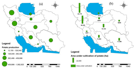 (a) Potato production in AEZs of Iran. (b) The area under the cultivation of potato in AEZs of Iran.