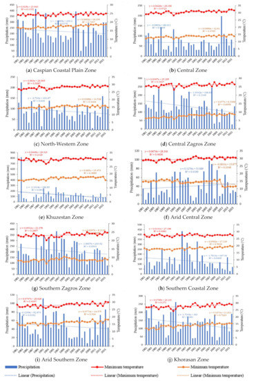 Iran is divided into ten AEZs, which are taken as a study area for this paper (see Figure 2). The main potato producing areas fall in AEZ-3, 4, and 6 (see Figure 3); their collective area constituted about 65% (95,604 ha) of the country’s potato growing areas. In this study, 10 synoptic stations were selected for projecting future climatic data. The location and general information for the selected synoptic stations are shown in Figure 2 and Table 1. The linear trends in climate parameters (maximum temperature, minimum temperature, and precipitation) of potato growing season in all the AEZs of Iran during 1981–2016, are proposed in Figure 4.