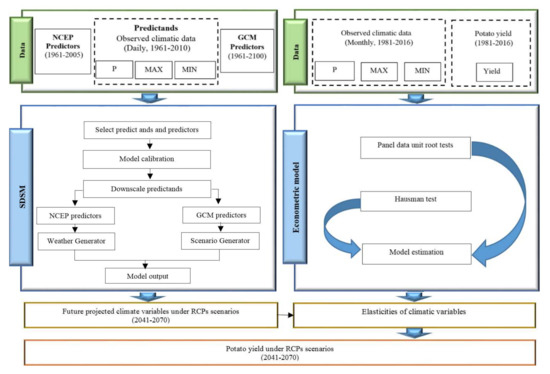 The main aim of the study is the investigation of projected climate change effect on potato yield and its variability. To reach this objective, two models were integrated. (i) The SDSM is applied to predict MAX, MIN, and P under two RCP scenarios for selected stations. (ii) An econometric model is used to determine the relationship between climate variables and potato yield to estimate potato yield based on the projected climatic parameters’ levels. Our study framework is depicted in Figure 5.