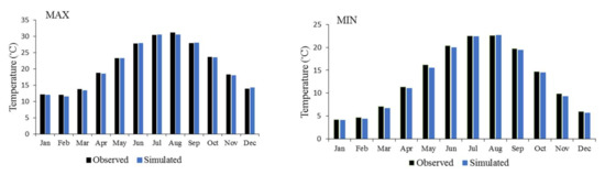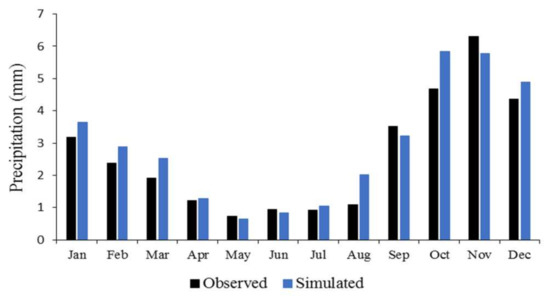 The model calibration was applied for the first 30 years (1961–1990) and after that the weather-generator module is utilized to evaluate the SDSM performance. Taking Babolsar station as an example, the observed and simulation data are compared by the summary and frequency analysis for the period of 1991–2005, as is indicated in Figure 6. Evaluations of the monthly average of MAX, MIN, and P demonstrated a satisfactory agreement between the measured and estimated data for MAX and MIN so that they are too similar. Although the rainfall output deferred more, specifically in October, it may be because of missing values of P that negatively impact the model performance [1].