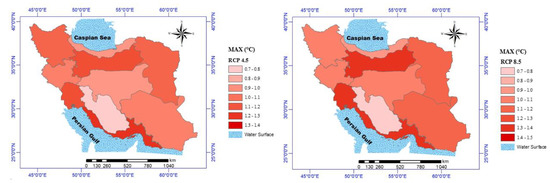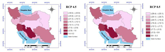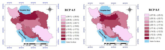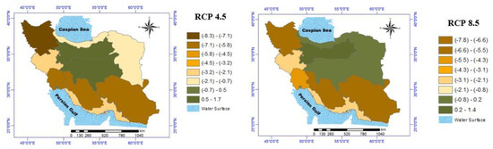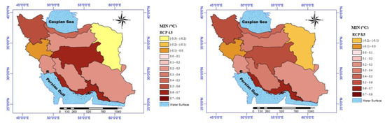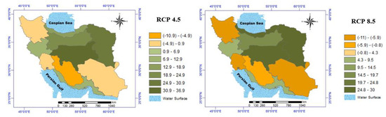 The outcomes indicated a −0.23 to 0.75 °C change, with respect to baseline, in the mean MIN of potato growth season under three RCP 4.5, among all periods. Under the RCP 8.5 scenario, the range of changes will be from −0.15 to 0.63 °C in the 2050s, compared to the baseline period. In total, this index would be increased in most of the zones (see Figure 8). The percentage changes in MAX and MIN of potato growing season under different RCPs for the 2050s, compared to the base period, are shown in Table 5.