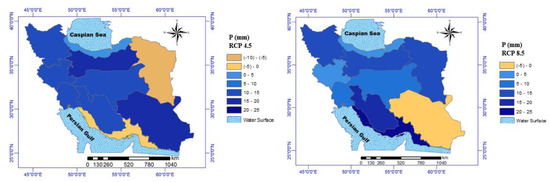 The percentage change in P of potato growing season under different RCPs for the 2050s, compared to the base period, are presented in Table 5. For the RCP 4.5, the mean P for potato growth season would be varied from −5.62 to 20.02%, among all zones in the 2050s. Under RCP 8.5, the range of changes would be between −4.50 and 24.06% in the 2050s period (see Figure 9).