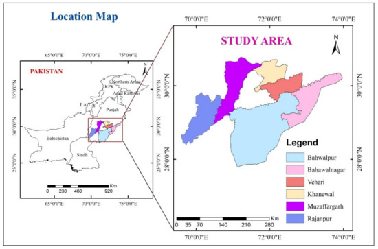 Respondents were selected through a multi-stage random sampling technique. Data were collected for the cropping year 2018–2019. A total of 480 farmers in Punjab were interviewed. Initially, we selected the Punjab province purposively. Then, in the 2nd stage, 6 districts (i.e., Khanewal, Vehari, Bahawalpur, Bahawalnagar, Muzaffar Garh, and Rajan Pur) were selected (see Figure 1). In the next stage, from each selected district, 80 respondents were chosen for data collection through random sampling. A well-structured questionnaire was used to collect data regarding farmer’s perception about different risk sources, management strategies, detail of farm inputs and outputs, farmer’s knowledge about climatic changes, their limitations about adaptation, and the socioeconomic characters of farmers. Insights for constructing our questionnaire were taken from a similar work [45,46,47]. For accuracy, we involved the opinions of educated and respected local leaders and representative from the agricultural department. To avoid missing any important elements, we performed and trained a pretest for the questionnaire.