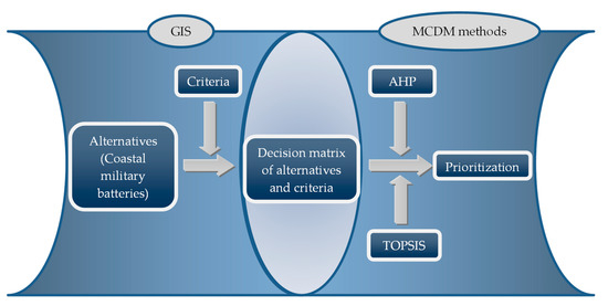 For all of the above reasons, this study presents a GIS–MCDM combination methodology to carry out a prioritization of obsolete military coastal batteries with the aim of them being reconverted into touristic, scientific, and cultural places of interest. The study area is located in the Municipality of Cartagena, Southeast Spain. A GIS software is used to provide the attribute table of alternatives and criteria (decision matrix), and the proposed decision problem is solved through a combination of MCDM methodologies based on the TOPSIS and AHP techniques (Figure 2). The AHP approach is applied to determine the weights of the criteria whilst the TOPSIS method provides a ranking of alternatives in order to obtain a prioritization.