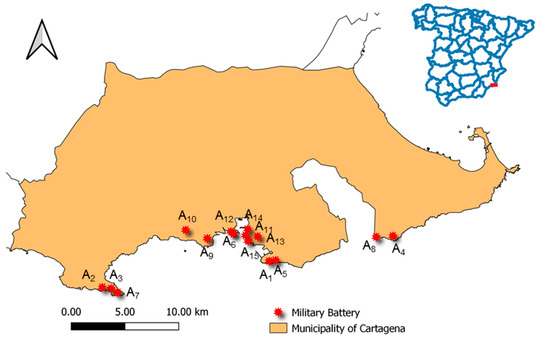 Due to its excellent orography, a set of artillery groups composed of batteries with large-caliber artillery pieces were distributed around strategic points on the coast of Cartagena in the 19th and 20th centuries. Those batteries played an important role until the end of the Spanish Civil War. After the Second World War, new weapons development was achieved and such batteries became obsolete. Although some of them still have the cannons that protected the city back then, nowadays most of these military batteries lie derelict or in ruins. As a consequence of their historical heritage and importance, Spanish and regional legislation is attempting to preserve and protected the main batteries, which make up a total of 15 batteries (see Figure 3). In order to do so, some initiatives from the Cartagena administration have sought to convert these coastal military batteries into interesting and attractive places. Their reconstruction and preservation would not only allow for an increase in the environmental offer or contact with nature to the inhabitants of Cartagena, but would also offer an additional attraction to the touristic offer of the city, which received in 2019 a total of 160,870 visitors from countries such as the United Kingdom, the United States, Germany, and France [34].