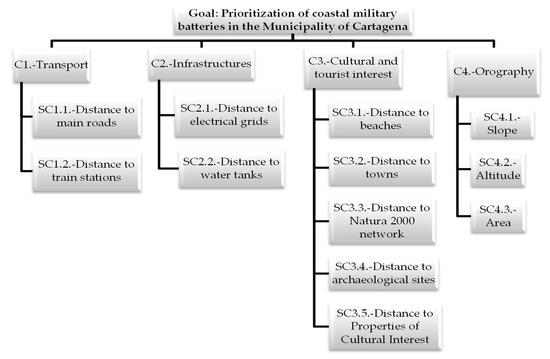 After carrying out the description of the alternatives, it is necessary to mention all the criteria and subcriteria that have influence in this decision problem. The variables (criteria and subcriteria) selected in this study were obtained through an advisory group composed of six experts from different fields, specifically with two PhD experts in tourism and environmental management, a faculty professor expert in such disciplines, a regional politician, a municipal land-use planning engineer, and a researcher with more than 10 years of experience in the reconstruction of historic buildings. In short, the criteria (C) and subcriteria (SC) of this case of study are shown through its hierarchy structure (Figure 4), which constitutes the starting point for the application of the AHP methodology.