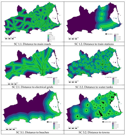 Once all the alternatives, criteria, and subcriteria are defined, the GIS software must be applied to obtain the database, which constitutes the decision matrix of this study. To do that and due to its free access, the software QGIS [35] was chosen. The starting point to the application of the GIS software consists of the generation of the subcriteria thematic layers. To do so, it is necessary to extract the digital cartographical information. Said information was obtained through several institutions, regional administrations, and government departments such as the Ministry for the Ecological Transition and the Demographic Challenge, National Geographic Information Center, General Directorate of Coasts of the Ministry of Environment, Information System on Land Occupation of Spain, Department of Public Works, and Planning of the Region of Murcia, etc.