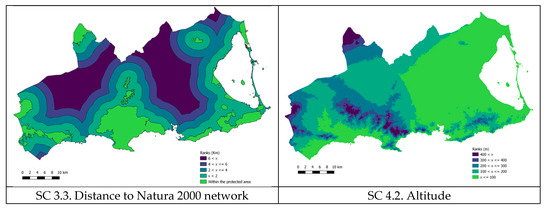 From that point, the different commands and editing tools of filter, slope, cut, join, etc., of QGIS enabled the generation of eight subcriteria thematic layers (Figure 5).