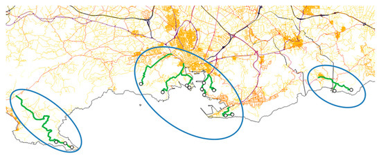 The mean slope of the accesses for each alternative (subcriteria 4.1) was calculated with the QGIS software using the thematic slope layer from the National Geographic Institute and the routes from the batteries to the points where vehicle access is possible (Figure 7).