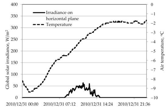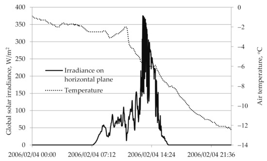 In the era of widespread use of artificial neural networks (ANN), improving the structure of estimation models is losing its importance. Numerous works prove that ANN models estimate radiation sums more precisely than classical empirical models [32,33,34,35] for the same input datasets. Therefore, it was not the model structure itself that we targeted for greater precision of estimation. The estimation of daily solar radiation using models based on the amplitude of the air temperature assumes that the course of solar irradiation produces a specific daily temperature distribution. This assumption works well in dry tropical and continental climates, resulting in precise estimation of solar radiation. However, when air masses of polar-marine origin dominate in the local climate, and clash with masses of tropical and continental origin, the relationship between the temperature course and radiation is not so obvious. In Poland, often intense influxes of warm or cold air masses are present within a single day. On such days, changes in the air temperature are not related to solar irradiation, especially in the months of the cold season, when the sunny days are short, and the altitude of the Sun is low. This phenomenon is illustrated by the charts of temperature and solar irradiance on the horizontal plane in Figure 1 and Figure 2. In the first case, for example, on February 4, the air temperature gradually decreased from −0.9°C to −12.5°C. The temperature amplitude alone would suggest a high daily radiation, while in reality it was equal to only 3.15 MJ/m2, a value significantly below the daily average in February. The temperature changes on that day were the result of an influx of cold air masses and were not related to solar irradiation. In the second case, on December 31, from 1:30 a.m. to 12 a.m., the temperature gradually increased from −9.4°C to −1.7°C, and that increase was not affected by solar radiation due to the cloud cover on that day being complete. The solar irradiance did not exceed 65 W/m2, and the daily radiation was only 0.71 MJ/m2. The temperature increase was therefore only attributed to an advection of warm air masses.