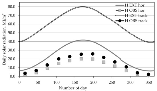 during the calendar year. In addition, the average daily solar radiation recorded on the measurement station on horizontal and the 2-axis tracking planes were included. Considering the trend of the variability of the quantities presented in the graph, a hypothesis arises that for estimation of solar daily radiation on a 2-axis tracking plane, the use of is more justified. To solve this question, we compared the precision of the H−S model in both variants of calculating extraterrestrial solar radiation.