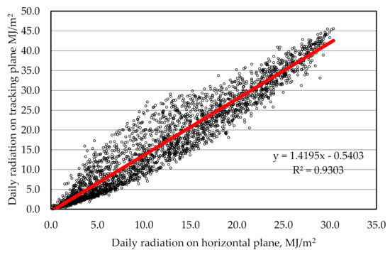 Additionally, we checked what precision could be achieved in estimation of daily radiation on the tracking plane by the indirect method—by first estimating horizontal then calculating tracking. To calculate the estimated daily radiation from the horizontal plane to the 2-axis tracking plane , the relationship was used (see Figure 4):
