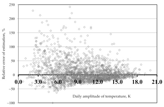 We verified whether this daily amplitude of temperature is related to the accuracy of estimating solar daily radiation. The set of input data of the model and results of the estimation are sorted in ascending order, according to the daily amplitude. Figure 5 presents the dependence between the relative error of estimating daily radiation and the amplitude of temperature. In the majority of cases, the estimation on days with low temperature amplitude results in overestimating the daily radiation. In turn, when the amplitudes are high, the daily radiations are generally underestimated.