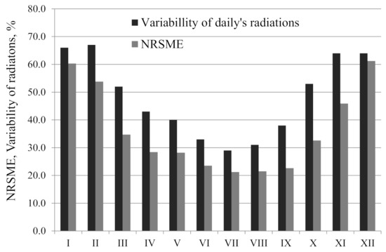 The accuracy of the estimation of daily solar radiation in monthly intervals changes with the season of the year. We noticed that estimation errors are related to the coefficients of variation of daily sums in given months. Figure 6 shows the NRSME diagram of the HS model and the coefficients of variation of daily radiations in each of the 12 months of the year. The smallest variability of daily radiations found in July and August corresponds to the highest model accuracy. However, in December, January, and February, when the variability of daily radiations is the highest in the year, the estimation is burdened with the largest errors.