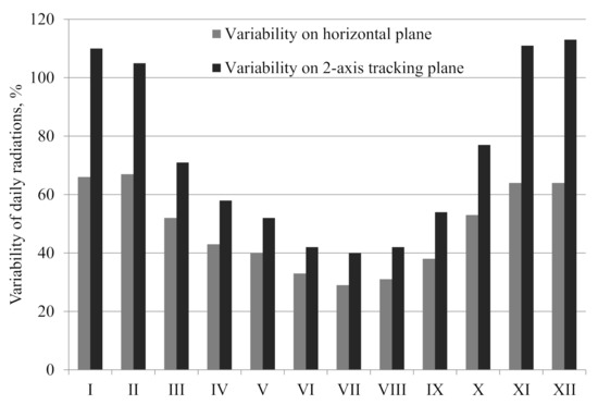 The greater variability of daily solar radiation on tracking planes in comparison to the horizontal plane results from the structure of global radiation itself. The global radiation consists of the direct, diffuse, and reflected radiation components, and the diffuse one is the most stable value. This component is present at the highest proportion in global radiation on the horizontal plane.