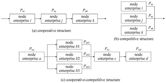 where Pni is the contract execution ability of enterprise i facing n competitors and Fi is the profitability index for enterprise i. The denominator in (6) is the maximum profitability of n related member enterprises both inside and outside the SCN, for which Pni equals 1 when enterprise i has maximum profitability. The ability to execute contracts in the overall SCN is expressed as Pn, the value for which depends on the relationship between the node enterprises. The fundamental SCN structures are cooperative mode, competitive mode and hybrid cooperative-competitive mode, as shown in Figure 5.