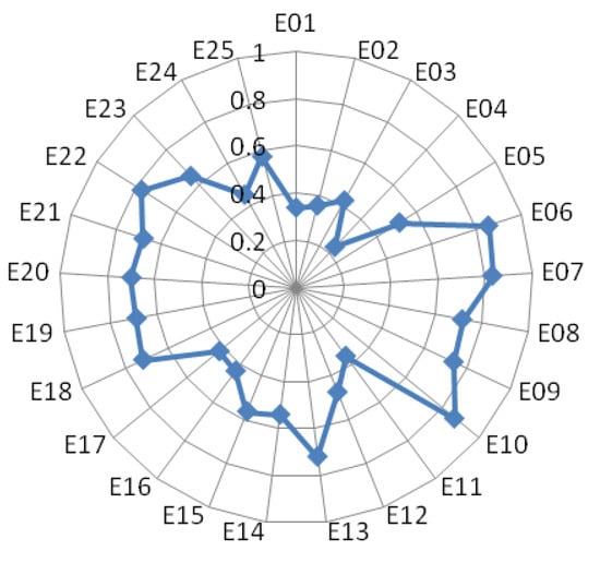 where TR is the total revenue and OC is the operating cost. According to Equation (12), for the 25 comparative indices were calculated, and the results are presented in Figure 8. It was found that the values for , , were all larger than 0.8, indicating that they had a greater impact on the GPR than any other index. Research has shown that there is a competitive relationship between the coal industry and the petrochemical industry, with crude oil prices having a significant impact on coal industry profitability [59], which is in accordance with the calculated values for .