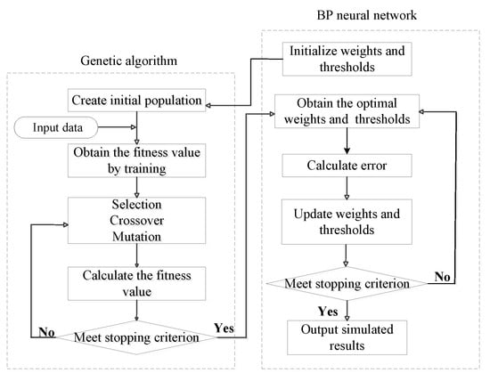 As a random search method based on the biological evolution [60], genetic algorithms (GAs) have a remarkable ability to escape the local optima and find a global optimal solution that minimizes the differences between the actual and calculated values; therefore GAs have become increasingly popular for solving optimization problems [61,62]. As they use the survival of the fittest principle, GAs guide the search to the most promising areas in the stated space, accelerating the dynamic optimization process for the BP-ANN weights and thresholds [63]; therefore, in this study a GA and BP-ANN were combined to improve the models’ accuracy and convergence, the hybrid algorithm for which is shown in Figure 9.
