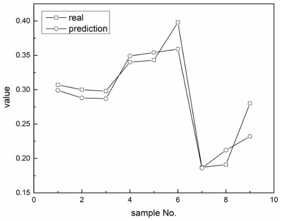 In this article, China Coal Energy (CCE, stock code: 601898), China Shenhua Energy Company Limited (CSEC, stock code: 601088) and Yanzhou Coal Mining Company Limited (YanzCoal, stock code: 600188) were selected as the research objects, with a time period ranging from the first quarter 2012 (2012Q1) to first quarter 2015 (2015Q1). Data from 2012Q1 to 2014Q2 were chosen as the BP-ANN training data, and data from 2014Q3 to 2015Q1 were selected as the test values. The BP-ANN simulated results are listed in Table 3. The RMSE was 0.0231 and the R2 was 0.998, indicating that there were deterministic relationships between the GPR and E06, E07, E10. As the influential factors for the coal industry GPR are complex, the above relationships are only reflections of certain situations under established technical and equipment conditions; however, whether these results have a wider adaptability range needs to be verified with additional samples. The average relative error was −2.32%. Figure 10 shows the relative errors in the GPR output values for the BP-ANN models in comparison to the real values, indicating that the BP-ANN-based enterprise profitability model is feasible, and proving that there are significant correlations between the coal chemical industry earning ability and crude oil prices, coal prices and coal output.