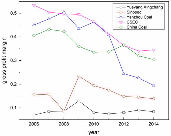 Figure 11 shows that the GPR value trends for the companies since 2006 were decreasing year on year, which was primarily due to overcapacity in China’s coal chemical industry. The GPR for CCE and CESC are better than for YanzCoal, indicating a more stable profit-earning ability. The two petrochemical companies, coming from more competitive industries, (Sinopec and Yueyang Xingchang Petro-chemical Co. Ltd., Yueyang, China) have a more stable GPR because of better SCN integration. It could be concluded, therefore, that to achieve sustainable profitability, the coal chemical industry should have strong capital integration with the petrochemical industry to improve industrial SCN integration and financial profit-earning and to increase the ability to combat risks.