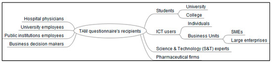 The survey included publications in repository Scopus, published in 2009–2020. The searching strings covered the words “Technology Acceptance Model” AND “Cloud Computing”. Eventually, 124 publications were selected. Table 1 includes twelve publications, which were cited by more than 50 readers. The TAM questionnaires’ recipients are presented in Figure 1. Questions in the survey concern mainly acceptance of new ICT; however, none of researchers emphasized sustainability. There is still a chance to undertake research on users’ recognition of sustainable issues.