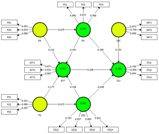 The determination factor R2 for latent variables indicates moderate to a strong fit of the model. R of the variable PU at 0.445 means that the model explains 45.5% variance of the variable. The same applies to the variable SSQ. The model explains 45.2% of the variance. The model also explains the 70.8% variance of the intention to use and 71.7% variance of attitude.