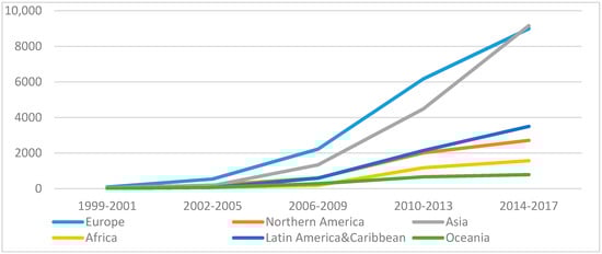 Sustainability reporting is the most visible way of illustrating how a company achieves sustainable development goals. It is seen as an expression of greater accountability towards stakeholders, as well as the implementation of the sustainable business model [,,]. Although sustainability reporting is not mandatory for most firms, the number of reports (social reports, environmental reports, CSR reports or sustainable development reports) is increasing significantly. Analysis of reports, carried out for the purposes of this article, based on the Sustainability Disclosure Database [] for the years 1999–2017 reveals that almost 54% of all reports come from the last four years, and almost 90% are a result of the last eight years. In addition, the rapidly growing trend applies to reporting organizations. In the analyzed period, there were 14,000 reporting organizations, and 70% of them were reported in the previous four years. In turn, the geographical analysis shows that sustainability reporting is most popular in Europe. However, in recent years of the analysis, the European reporting level has been exceeded by Asia, in which the dynamics of reporting growth is the strongest. Oceania shows the least interest in reporting, with a low growth trend. Other areas are characterized by systematic moderate growth (Figure 1).
