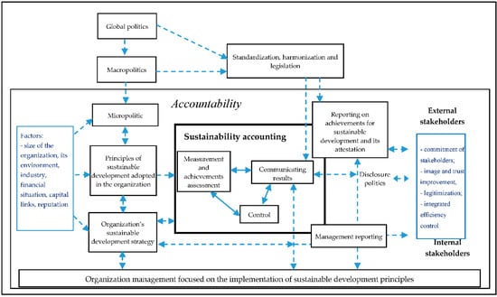 The author’s concept presents how to expand the tasks of accounting in relation to its conventional approach by extending the accounting subject to financial and non-financial categories regarding social and environmental aspects. In line with the positive accounting theory approach, sustainability accounting is to be a tool of communication with various groups of company stakeholders, a certificate of the company’s “moral maturity”, legitimacy of sustainable business and an “information signal”, confirming the removal of information asymmetry between stakeholders [,,,]. Therefore, the paper suggests the key elements of a conceptual framework for sustainability accounting following Conceptual Framework of International Financial Reporting Standards, i.e., sustainability accounting purposes, users of information generated from the sustainability accounting system, qualitative characteristics of useful information from a sustainability accounting system, the subjective scope of sustainability accounting, sustainability accounting reports, including rules for the recognition, valuation and presentation of elements of reports and rules for verifying the reliability of information from a sustainability accounting system. Under these assumptions, a model approach placing sustainability accounting in the corporate accountability system is presented. It also allows the author to indicate factors influencing sustainability accounting, and thus to present sustainability accounting as a derivative of macro- and mezo-politics, general accepted sustainable development principles, standardization, harmonization and legislation of sustainability reporting, and also of micro-politic and the entity’s factors (like size, industry, financial situation, reputation), which determine the principles of sustainable development adopted in the organization and thus its strategy. The organization’s sustainable development strategy, in turn, determines what is to be measured, how to measure it and how to control it. Such a holistic approach has not been found in the research so far.