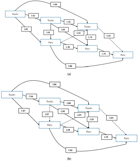 As shown in Table 5 and Figure 2, both the carryover effects during the evolution of B2B relationships were tested. H3 and H4 predicted that both trust (at T1) and firm performance (at T2) would have positive effects on the same constructs at T2 (trust) and T3 (firm performance), and that these carryover effects would increase over time with the evolution of B2B relationships. The results were quite interesting and showed the same pattern between trust and firm performance. Regarding the subsequent periods of B2B relationships (e.g., Trust: T1-T2→T2-T3; Firm performance: T2-T3→T3-T4), the carryover effects increased. In contrast, during the discontinuous periods of B2B relationships (e.g., Trust: T1-T2→T1-T3; Firm performance: T2-T3→T2-T4), the carryover effects remarkably decreased. These mixed carryover effects indicate that H3 and H4 were partially supported. Additionally, an unexpected finding was that firm performance (at T2) did not have a significant effect on trust (at T3). As shown in Figure 2a,b, positive firm performance (or negative firm performance) does not always affect a positive (or negative) trust during subsequent B2B relationship periods.