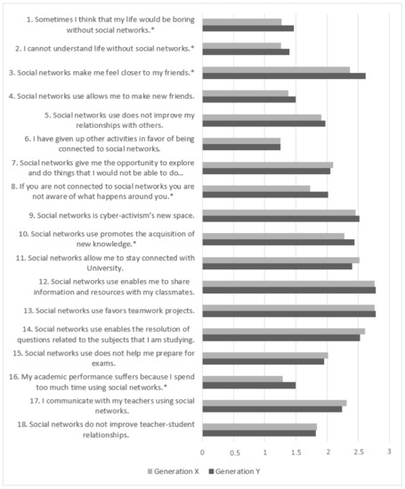 Continuing with the significant differences, we can observe how social networks have a different meaning for each generation. Although students belonging to Generation Y considered them an important element in their lives, Generation X students could not share that view. This difference may be due to the fact that the former group has grown up immersed in a highly technological environment, whereas the latter had to adapt to it, to learn how to use it, but has not completely rejected older instruments. Other authors have pointed out [37] that the difference is not in the use, but in the perception of technology, affecting the behavior in each mean.