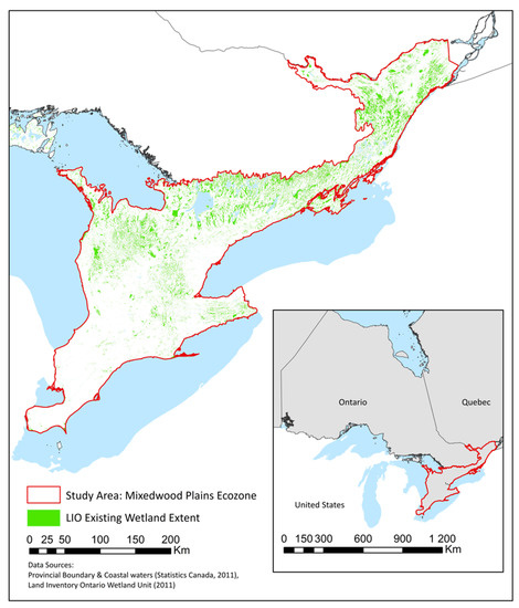 Study area map illustrating present wetlands within Ontario, Canada’s Mixedwood Plains Ecozone.