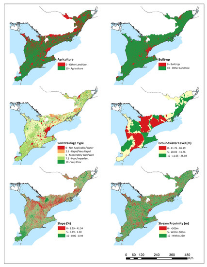The first research question asked: Which physical and ecological landscape criteria represent high suitability for wetland reconstruction? Cited articles for similar studies often named shallow groundwater, proximity to streams, soil drainage, and low slope as ideal properties for wetland reconstruction. Criteria were also considered based on previous wetland studies in the Mixedwood Plains. The Detailed Soil Survey (DSS) from the Canada Land Inventory (CLI) contained updated data from previous CLI soil surveys. These data are an updated version of that used by Snell [31] to create the first wetland inventory in Ontario. Additionally, Duck’s Unlimited Canada [32] utilized the CLI soil survey (combined with quaternary geology) to identify poorly and very poorly drained soils as indicators of historic wetlands. By using a current soil survey and ranking poorly and very poorly drained soils highest, consistency was maintained with these previously conducted studies. Last, to incorporate ecosystem services, two factors were considered areas of need: agriculture, and frequently inundated soils. In Ontario, where many wetlands have been eliminated due to intensive agriculture, the landscape is not only suitable for reintroduction of wetlands, but needs them [27]. Agriculture characterized by flood risk, runoff, soil erosion, and low biodiversity was included in the criteria in contrast to a wetland’s ability to mitigate floods, introduce and maintain biodiversity, slow erosion, and store and filter water [78,79]. Frequently inundated soils were included among the highest-ranking soil class to prioritize flood mitigation to sites that need it most. The ranking of each criterion represents its suitability to a wetland project with a range from 0 (worst) to 10 (best).
