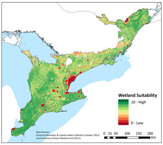Wetland loss in Ontario is the result of many small planning decisions in favor of agriculture, or industrial and residential development over these natural landscape features [19,31,32,34]. A larger-scale perspective of Ontario’s wetland reconstruction potential could help to facilitate planning for wetland projects provincewide. Around the world, wetland indices have been used to assess wetland loss and understand where wetland restoration may be most valuable and viable; however, such an index does not yet exist for Southern Ontario. This research aims to create a multi-criteria index that prioritizes areas best suited for wetland reconstruction in Ontario’s Mixedwood Plains. Therefore, to aid major agencies in their macroscale wetland restoration efforts, this study was guided by four research questions: (i) Which physical and ecological landscape criteria represent high suitability for wetland reconstruction? (ii) Of the common wetland suitability metrics, which are most important? (iii) Can a multi-criteria wetland suitability index (WSI) effectively locate high and low wetland suitability across the Ontario Mixedwood Plains Ecozone? (iv) How do best sites from the WSI compare and contrast to both inventories of presettlement wetlands and current existing wetlands? An overarching goal of this paper was to deliver landscape planners, ecological restoration scientists, regional planners, and environmental managers and decision-makers an applied example for systematically evaluating wetland suitability across space in temperate climate zones.