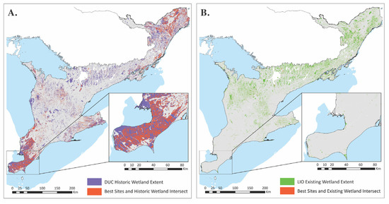 Overlay analysis displaying: (A) the intersection of the Ducks Unlimited Canada (DUC) historic wetland extent and best sites designated by the wetland suitability index (WSI) and (B) the intersection of a Land Information Ontario (LIO) existing wetlands and best sites designated by the WSI.