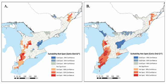 Hot spot analysis using Getis-Ord Gi* statistic for (A) census subdivisions and (B) quaternary watershed boundaries using mean wetland suitability index (WSI) values per areal unit. The threshold distance parameter was determined within this study and set to 32.2 km and 33 km for census subdivisions and watersheds, respectively.