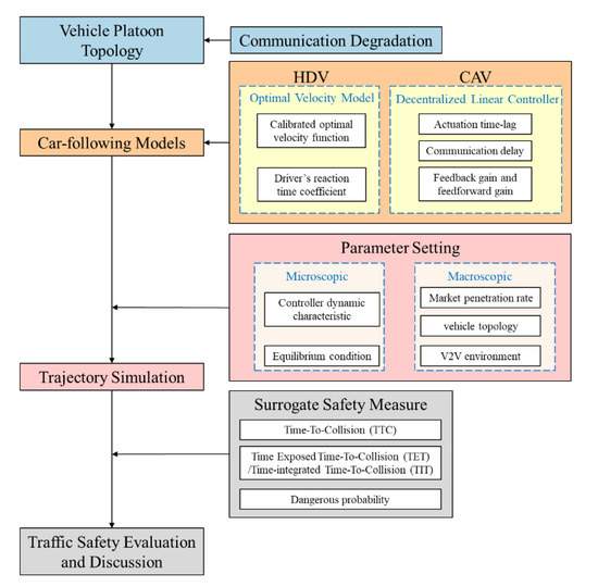 The overview of the proposed framework is shown in Figure 1, which has four parts: the vehicle platoon topology is responsible for dictating vehicle order and based on that, the corresponding car-following models for each car-following pair is picked to provide the longitudinal movement of CAVs and HDVs. By giving the first leading vehicle trajectory and car following models, a numerical simulation is conducted to generate each vehicle’s trajectory. By the trajectories for each vehicle inside the platoon, the traffic safety evaluation and discussion module gives the safety performances of input platoon trajectory data via SSM. More detailed explanations of each component are provided in the following sections. It is noteworthy that in the process of parameter setting, the microscopic level strives for capturing the parametric impacts of vehicle local and aggregated driving behavior on SSM, whereas the macroscopic level works towards parametric impacts of an aggregated platoon on SSM.