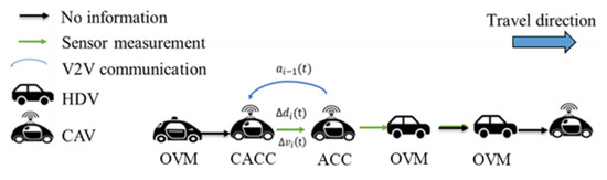 Traffic safety, as a global issue, has been drawing considerable concentration from the public during the past decades. Among all collisions, rear-end collisions are the most frequently occurring type [1]. Generally, rear-end crashes happen due to improper vehicular longitudinal single-lane motions. With the rapid and continuous development of sensing and communication technologies, connected automated vehicles (CAVs) equipped with on-board sensors and wireless communication devices provides unprecedented opportunities to drastically improve traffic safety [2,3,4]. For a CAV, cooperative adaptive cruise control (CACC) is a predominant approach to deal with inter-vehicle longitudinal driving behaviors by applying detected parameters from the preceding vehicle and real-time information received via vehicle-to-vehicle (V2V) communication. However, CACC can lose cooperation and degrade to ACC, owing to the incomplete information caused by both receivers (such as communication failure during transmission) or senders (such as a human driven vehicles (HDVs) without sending functions) [5,6]. Notably, communication degradation can affect a vehicle’s car-following behaviors and safety.