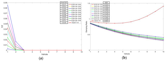 Parameter impact analysis on controller feedback gains: (a) TIT for each vehicle; (b) Damping ratio for each vehicle.