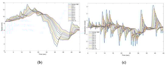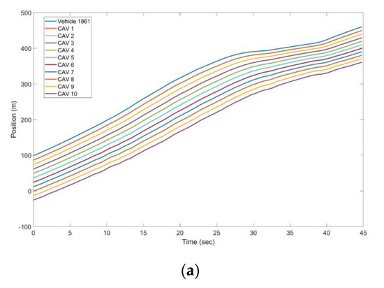 Without loss of generality, we chose the combination of 0.3/1.5/−0.64 for CAV and AV in the following experiments. As an example, Figure 4 plots the trajectory information used to compute SSMs and stability measures with the selected feedback gains. The leading HDV of the platoon is numbered 1861 whose driving data were extracted from the NGSIM database [30]. A proper filter has been applied on origin trajectory data to acquire clean data without sudden acceleration change or other wrong information.