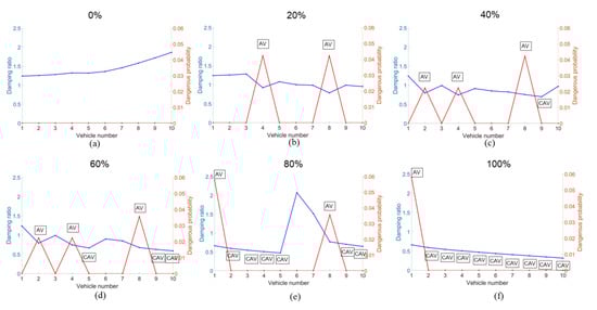 Damping ratio and dangerous probability per vehicle of example case under different CAV (AV) market penetration rate without degradation: (a) 0%; (b) 20%; (c) 40%; (d) 60%; (e) 80%; (f) 100%.