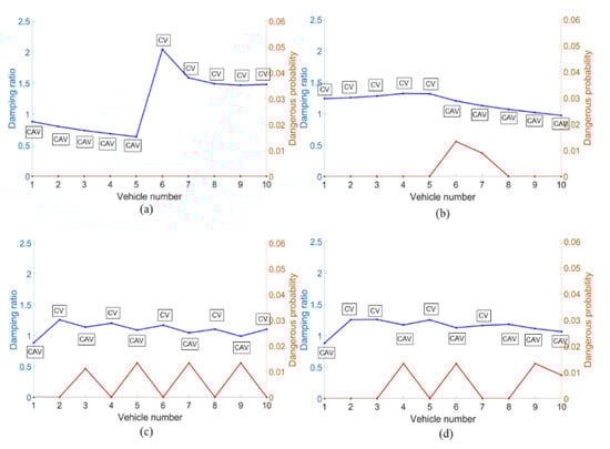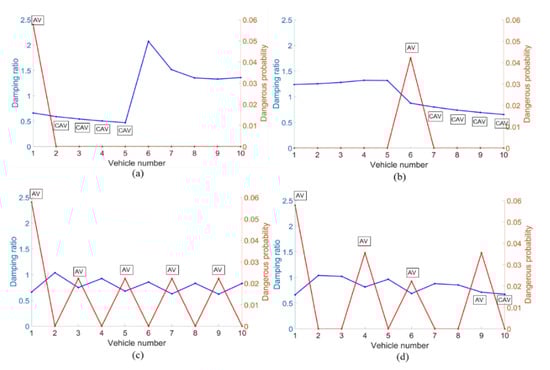 Mixed vehicle system dangerous probability and damping ratio under 50% CAV(AV) market penetration in V2V environment: (a) Situation 1; (b) Situation 2; (c) Situation 3; (d) Situation 4.