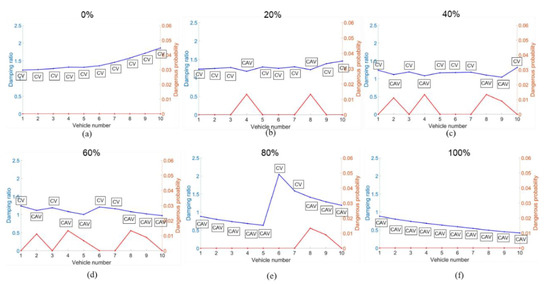 Damping ratio and dangerous probability per vehicle of example case under different CAV (AV) market penetration rate considering degradation: (a) 0%; (b) 20%; (c) 40%; (d) 60%; (e) 80%; (f) 100%.
