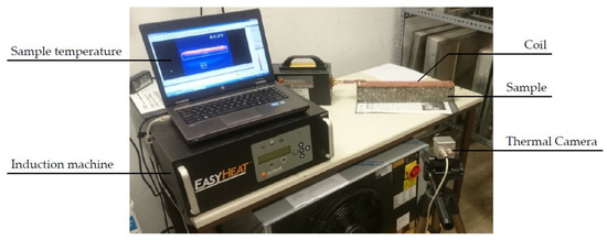 Figure 2 presents the configuration of the healing treatment, with the induction machine, the coil, the thermal camera, and the asphalt sample.