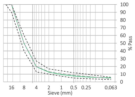 The particle size distribution of the aggregates of the new PA mixture, including the highest and lowest limits requested by the Spanish standards [26], are presented in Figure 3. The percentage of each material used in its design is included in Table 6. The optimal percentage of virgin binder was 4% w/wmixture.