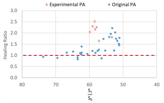 A slight variability inherent to this test can be observed in Figure 5, where the healing ratio achieved in all the samples is plotted against their stiffness after the first fatigue test. In this same figure, the results obtained in [6] for the original PA mixture were added to compare the healing performance of both mixtures. It should be noted that in this case, different deformation levels were applied. According to the results in Figure 5, it is clear that recycling healable asphalt mixtures including a rejuvenator is possible without losing the healing capacity of the new mixes produced.