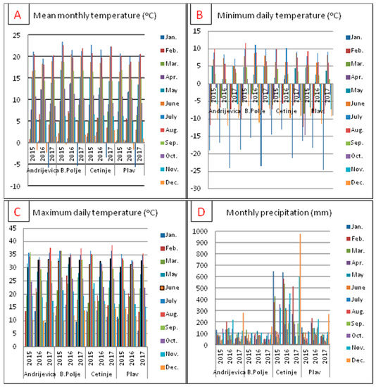 Meteorological data for the cities: Andrijevica, Bijelo Polje, Plav, and Cetinje in the period 2015–2017. (A) Mean monthly temperature (°C); (B) Minimum daily monthly temperature (°C); (C) Maximum daily temperature (°C); (D) Monthly precipitation (mm).