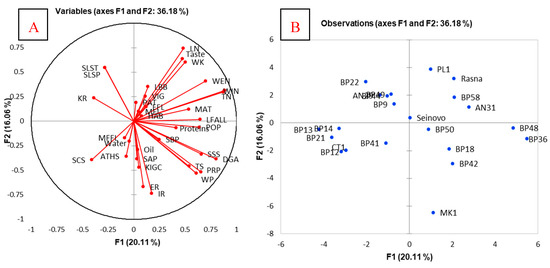(A) The scatter plot of the variables * of the first two principal components; (B) The scatter plot of 22 genotypes. * Vigour (VIG), habitus (HAB), time of leaf bud burst (LBB), male flower longevity (MFL), female flower longevity (FFL), dichogamy (MFFL), maturity date (MAT), the date of end of vegetation (LFALL), weight (WEN), weight of kernel (WK), kernel ratio (KR), length (LN), width (WIN), thickness (TN), fruit roundness index (IR), shape in longitudinal section through suture (SLST), shape in longitudinal section perpendicular to suture (SLSP), shape in cross section (SCS), shape of base perpendicular to suture (SBP), shape of apex perpendicular to suture (SAP), prominence of apical tip (PAT), position of pad on suture (POP), prominence of pad on suture (PRP), width of pad on suture (WP), depth of groove along pad on suture (DGA), structure of surface of shell (SSS), thickness of shell (TS), adherence of two halves of shell (ATHS), ease of removal (ER) and intensity of ground colour (KIGC).